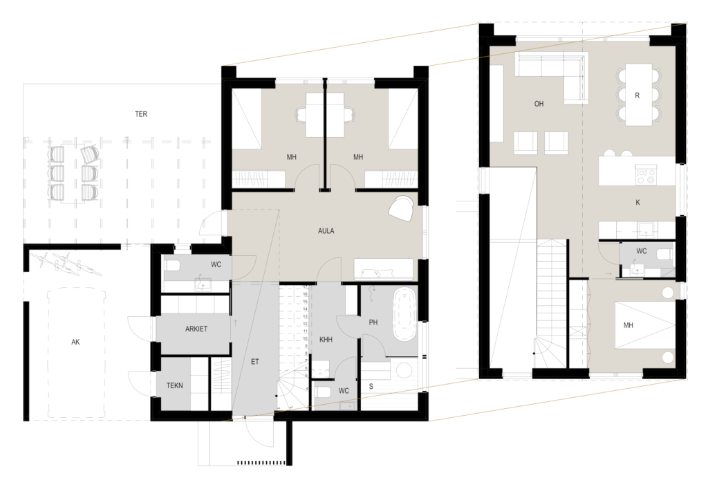 Alakertaan on mahdollista rajata kolme pienempää huonetta, minkä lisäksi alakerrassa on sauna ja spa sekä kulku terassille.