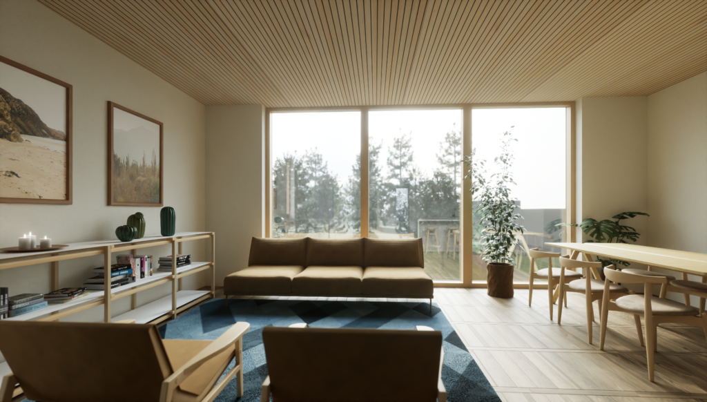 Toisesta kerroksesta löytyy avoin keittiö-oleskelutila sekä päämakuuhuone, josta on pyykkikuilu suoraan kodinhoitotilaan.