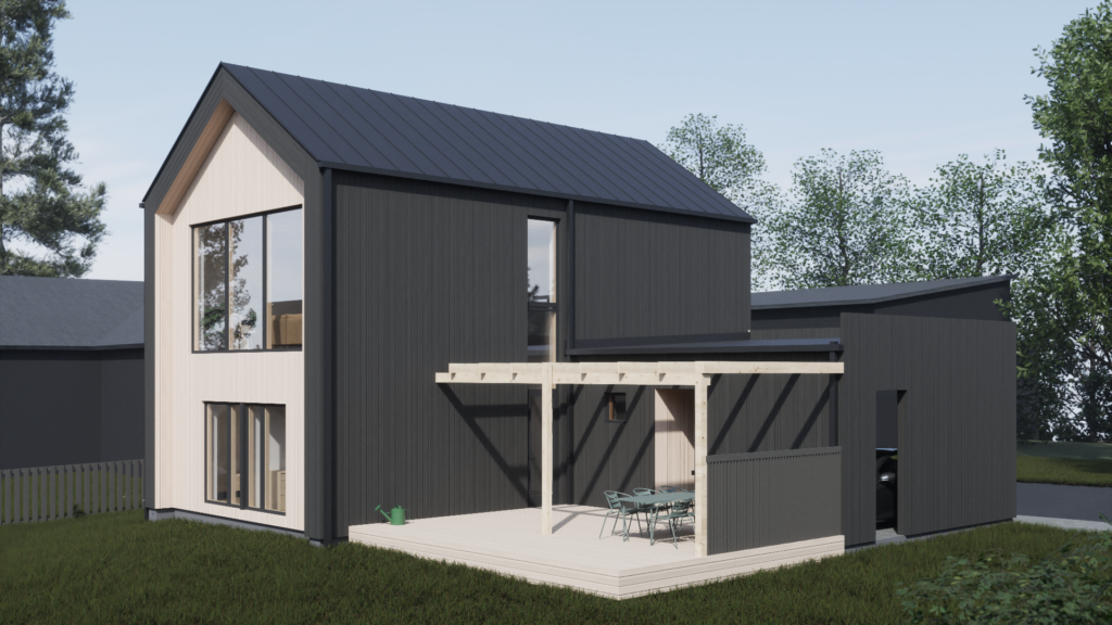 Kortteli-sarjan pienin malli 150 on näyttävä ja tehokas omakotitalo. Tyylikäs eteinen avautuu korkeana tilana ja ohjaa yläkertaan.