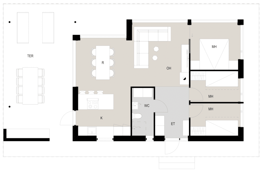 Mallin pohjaratkaisu on näyttävä mutta tehokas; heti etuovelta avautuu pitkä näkymä, joka johdattelee L-muotoinen oleskelu-ruokailu-keittiökokonaisuuteen.