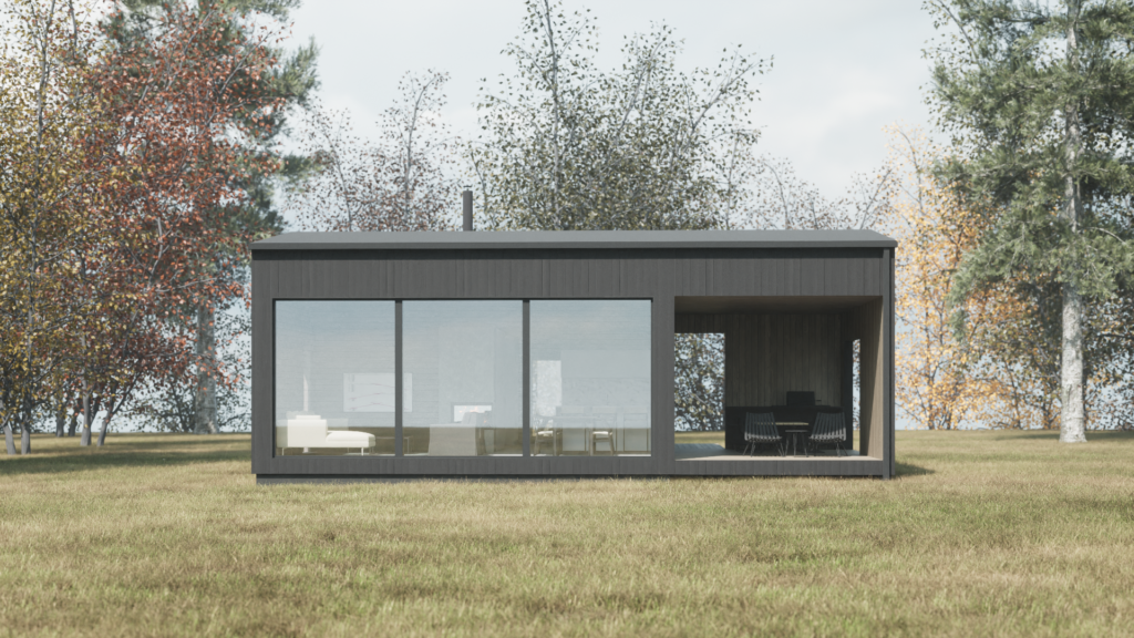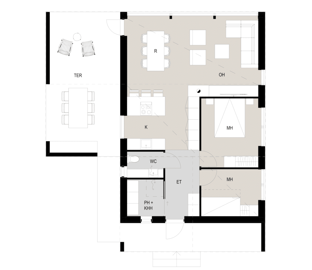 Sivuovesta on käynti katetulle terassille, jossa on tilaa kesäkeittiölle ja terassikalustukselle.