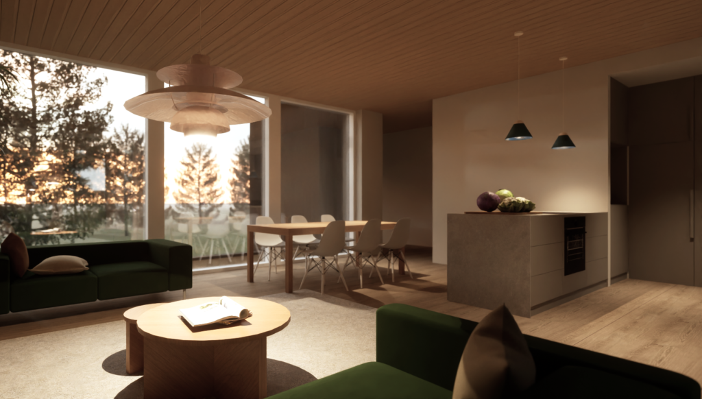 Olohuoneen sohvalta on näkymiä talon kummallekin sivulle ja kulku yläpihan katetulle terassilla.